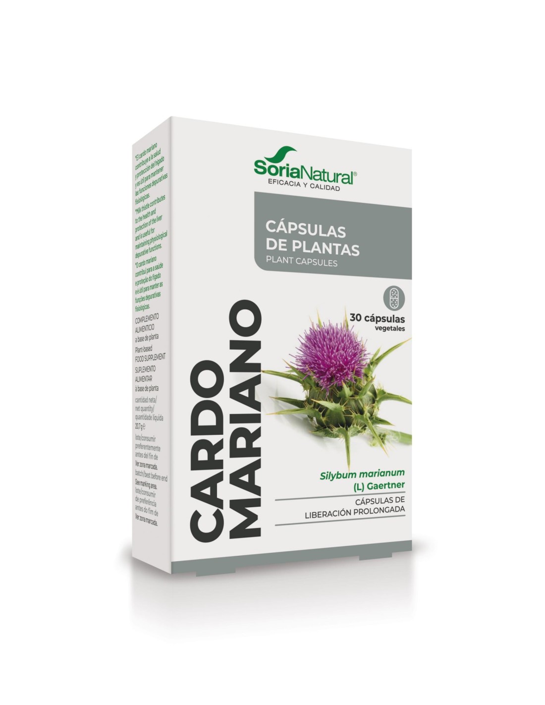 Extracto seco Cardo mariano (Silybum marianum (L.) Gaertner) Ratio 40:1, Silimarina 80%, silibina, silidianina y silicristina 16%) 250 mg Agente de carga (Celulosa microcristalina) 100 mg Agente de recubrimiento (Hidroxipropilmetilcelulosa) 96 mg Agente de carga (Estearato de magnesio) 40 mg Antiaglomerante (Dióxido de magnesio) 10 mg