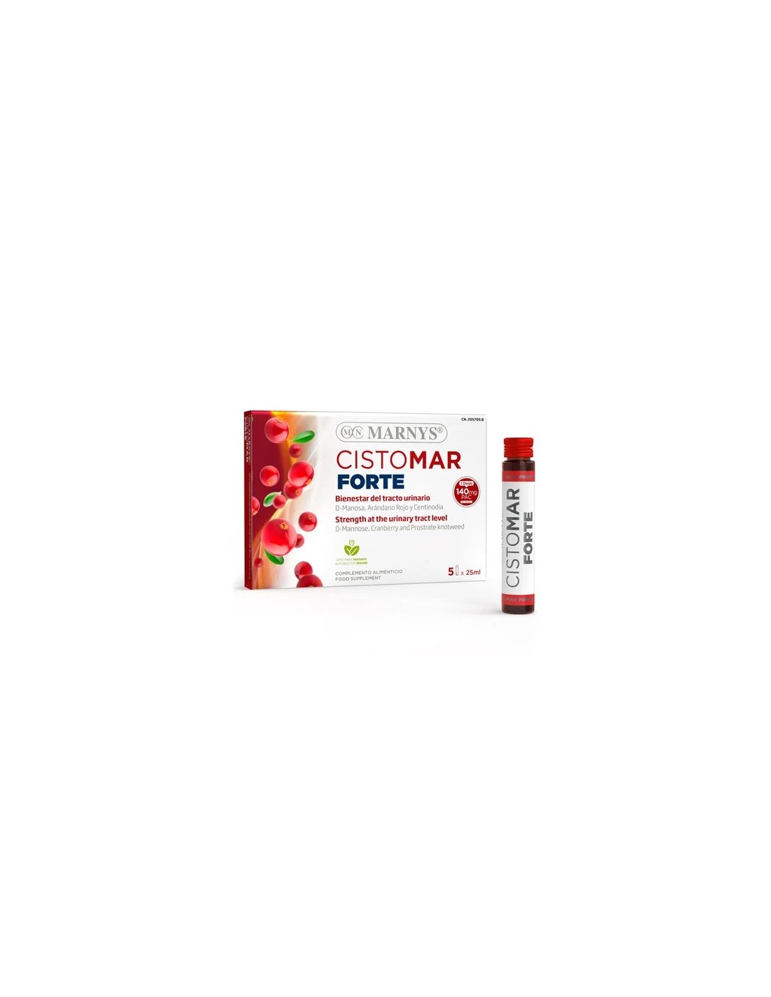 Agua, glicerina vegetal, D-manosa, emulgente (polisorbato 20), concentrado en polvo de fruto de arándano rojo (Vaccinium macrocarpon), aromas (natural, frutos rojos y cereza), gluconato de zinc, vitamina C (ácido L-ascórbico), espesante (goma xantana), concentrado en polvo de las partes aéreas de centinodia (Polygonum aviculare), conservante (sorbato potásico), concentrado en polvo de hoja de romero (Rosmarinus officinalis), concentrado en polvo de vitamina E (acetato de DL-α-tocoferilo), concentrado en polvo de vitamina A (palmitato de retinilo) y edulcorante (sucralosa).